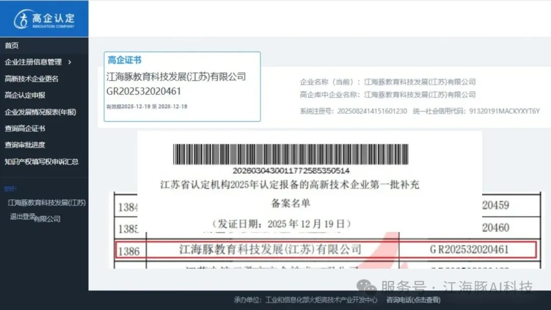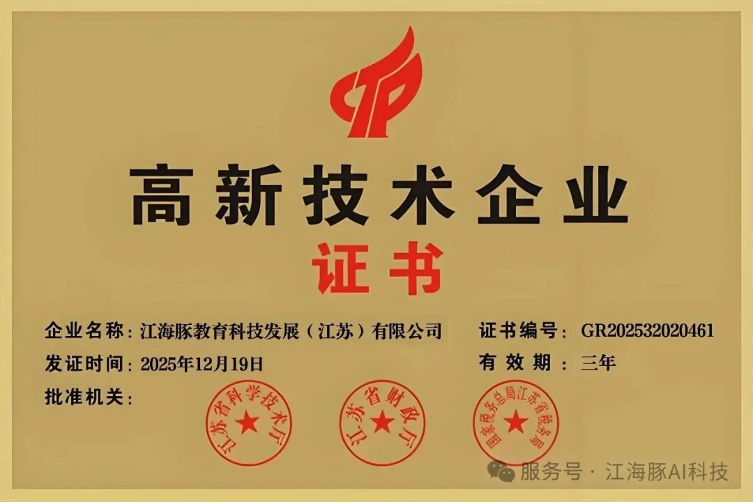 近日,全国高新技术企业认定管理工作领导小组办公室正式发布《江苏省认定机构2025年认定报备的高新技术企业第一批补充备案名单》,江海豚教育科技发展(江苏)有限公司凭借卓越的科技创新能力、扎实的研发投入及规范的运营管理,成功跻身国家高新技术企业行列!证书编号:GR202532020461,发证日期:2025年12月19日。这是公司发展历程中具有里程碑意义的时刻,标志着我们在“AI+教育”领域的深耕获得国家级权威认可!